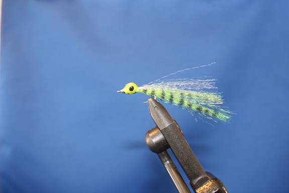 - Wing: Thin bunch of White Ultra Hair with four strands of Pearl Flash-A-Bou topped with Chartreuse Ultra Hair and the Chartreuse Ultra Hair is banded with a black sharpie marker