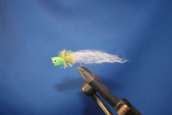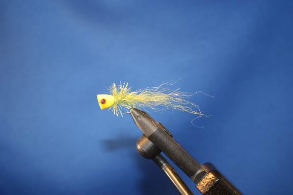- Popper: Dished Faced Foam Chartreuse Popper, with 3D Neon White with black centers applied with epoxy. There are many styles of popper heads which are effective the style you choose is strictly based on personal likes and what you would like the popper to accomplish on the surface of the water. The popper is super glued to hook shank over a bed of thread.