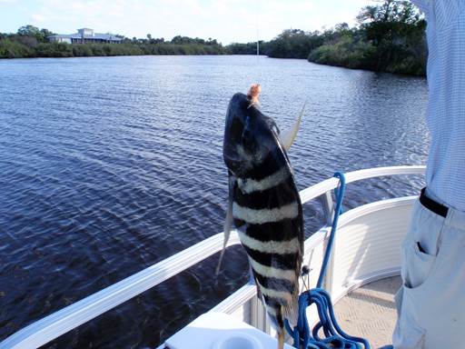 Sheepshead [Archosargus probatocelphalus], are also referred to as convict fish, zebra fish and Southern sheep. They are a member of the Sparidae Family which includes porgy’s and sea bream.