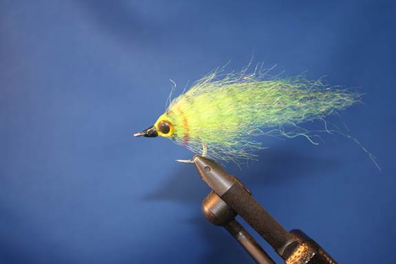 - Body: Barred chartreuse marabou fibers, tied in by the tip and twisted with the thread and wrapped forward. Several bodies can be done at one time. After you finish spiraling the thread, touch it and the mono with a drop of super glue and begin your next body. They can then be cut apart and attached to the hook.