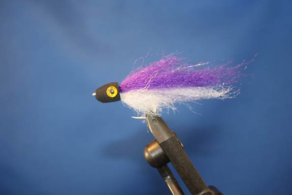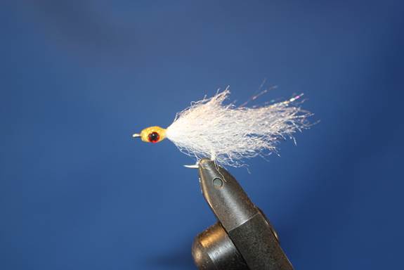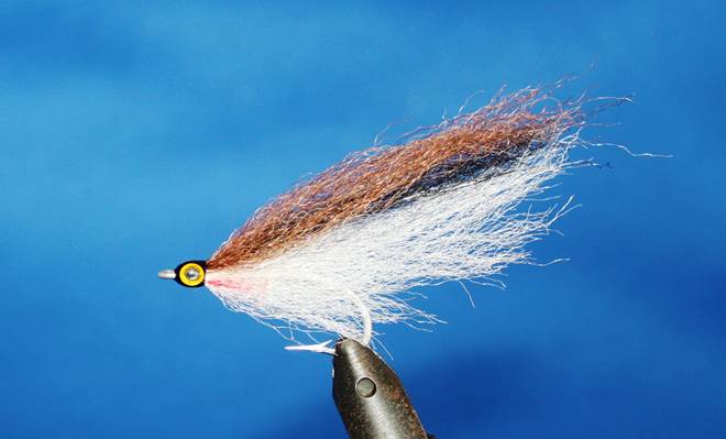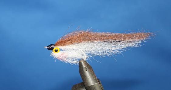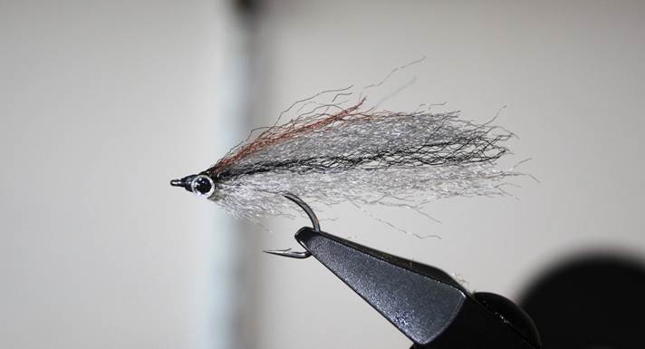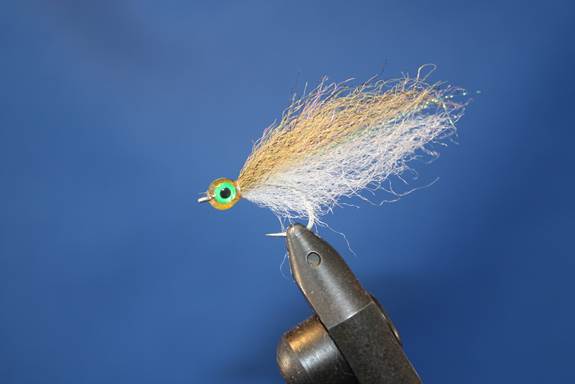 - Wing/Body: White EP Fibers with six strands of Silver Flash-A-Bou on top, followed by a thin bunch of Black EP Fibers, topped with Brown EP 3D Fibers.