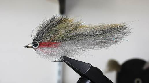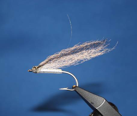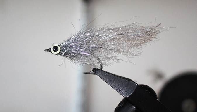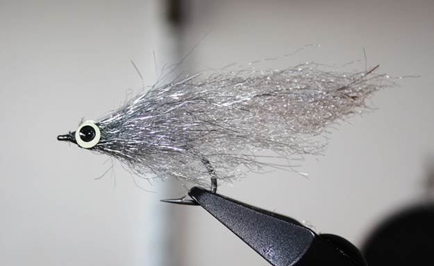 - Wing/Body: Thin bunch of Silver/Grey EP Fibers, topped with Grey EP Fibers, followed by four to six strands of Silver Holographic Flash which is follow by Mullet EP Fibers.