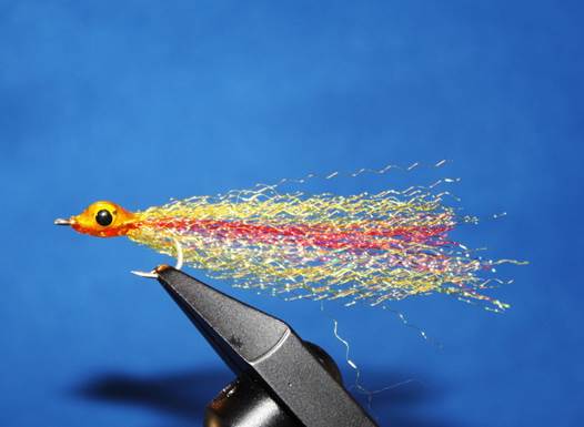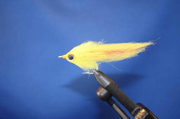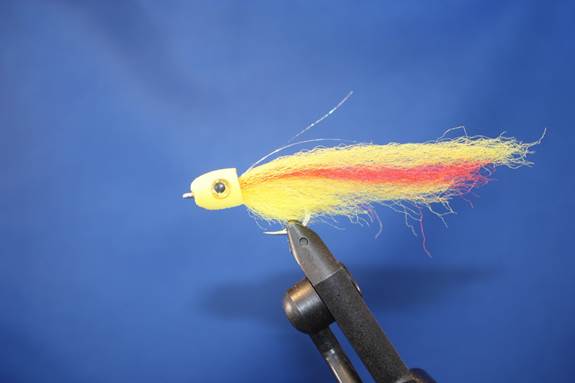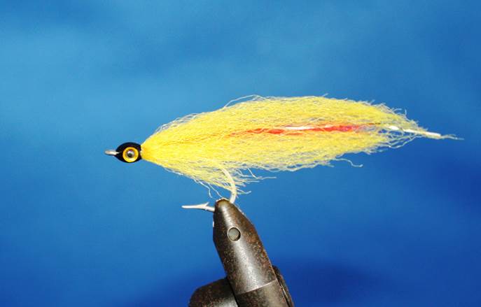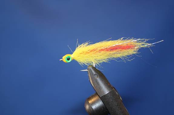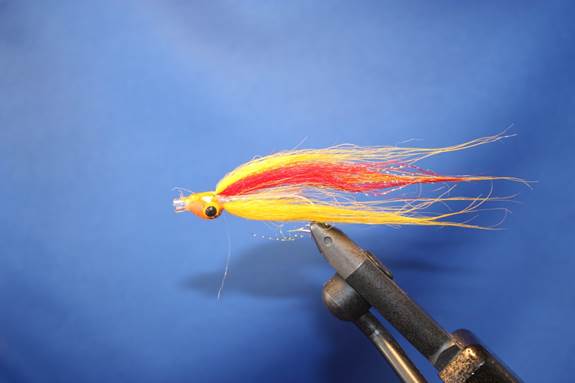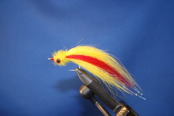 - Wing/Body: Yellow EP Fibers with six to eight strands of Silver Flash-A-Bou, with a thin bunch of Red EP Fibers and topped off with Yellow EP Fibers