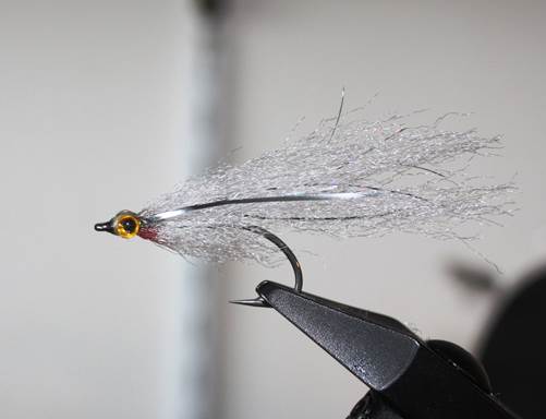 - Wing: 3 strands of Silver Flash-A-Bou and 3 strands of Pearl Flash-A-Bou and Black Bucktail