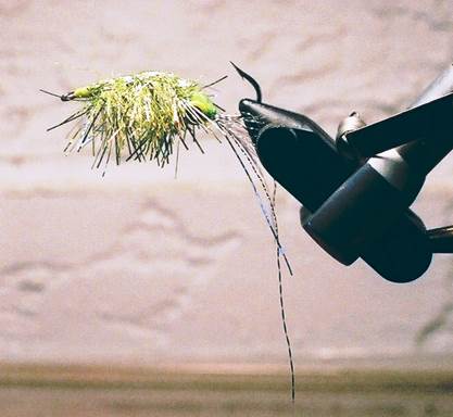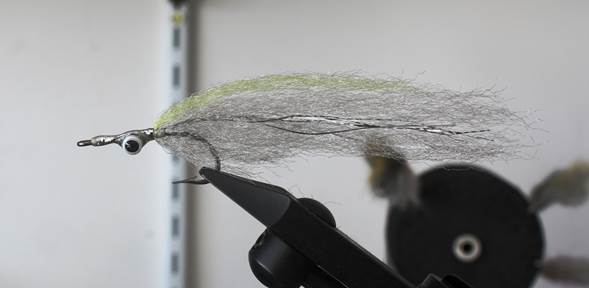 - Body/Wing: Silver/Grey EP Fibers topped with Silver Flash-A-Bou four or five strands and two strands of Black Krystal Flash followed by another thin bunch of Silver Grey EP Fiber and topped with a thin bunch of Pale Chartreuse EP Fibers.