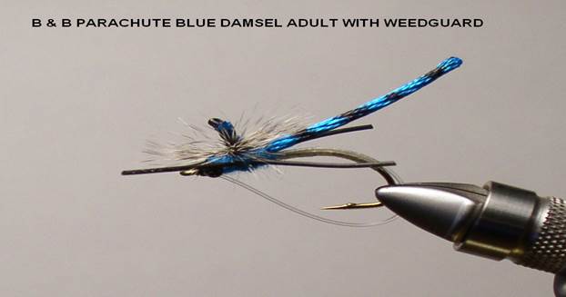NOTES: If you are using a weed guard, you will finish the weed guard before you wrap the parachute hackle. If no weed guard is being used, the parachute hackle is the last step in completing the imitation. This pattern may be constructed in several different color variations.