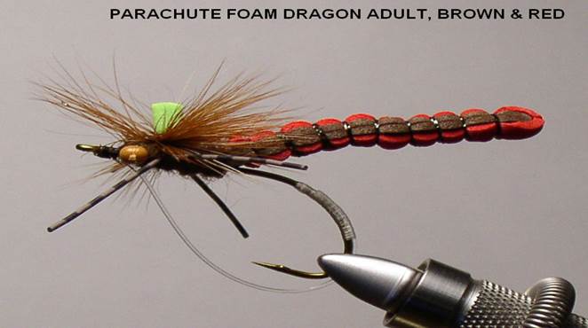 - Body extension: The body extension is pre-tied on a long, thin doll needle, using dark fine ultra-thread. The body consists of two lengths of dry cell fly foam, a strip of brown with a thinner strip of red laid on top. This is folded over the needle. As soon as a base is secure tie in two strands of black Krystal flash. This will be twisted and wrapped through the body. The segmented body is made with the ultra-thread and the rib is spiraled through the body. Whip finish, glue and slide off the needle. Attach the body extension to the hook shank at the mid-point on the top of the hook shank. Attach the body with white ‘A’ thread, then switch back to brown 6/0