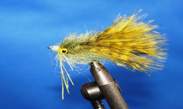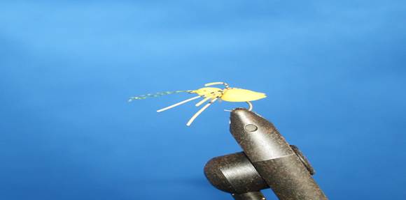 - Thorax and legs: Wrapped, two or three yellow/olive grizzly marabou feathers to the base of the bead
