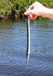 Atlantic Needlefish [Stronylura marina] they range in size 1.2 inches to 37 inches, they are silvery in color with Pale Green Iridescent hue to the back and they will congregate in small school and will feed on shrimp and small minnows.