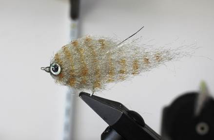 - Wing/Body: EP Minnow Fibers, with 3 strands of Silver Flash-A-Bou followed by EP Minnow fibers, combed and trimmed to shape and faint black barring follow by golden barring made with Sharpie markers. With a Gray spot on either side of the upper body back a little bit from the eyes