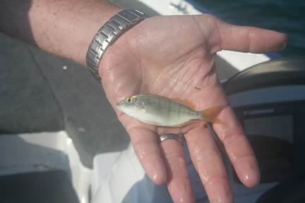 Pinfish [Lagodon chomboides] are also called shiners, sailor’s choice, porgy, scup. They grow to fourteen inches and are edible but are seldom eaten; however as bait the pinfish are also excellent. The juvenile pinfish of one inch to four inches can be found in large numbers in shallow coastal waters and estuaries and can be especially heavy around grass flats. Pinfish are primarily a non-schooling fish but can be found in loose groups on the grass flats and around the dock. They feed on fish eggs, shrimp, crabs, various worm and plant matter. They are in turn eaten by tarpon, snook, redfish, sea trout (Spec’s), Jack’s and many others. Oh by the way they also care caught be fly angler especially on shrimp and crab patterns.