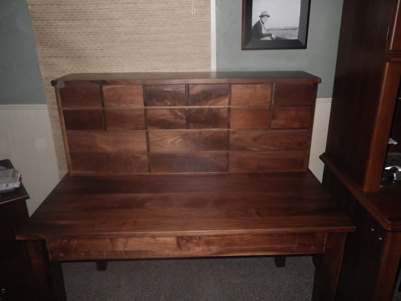 Here is my tying desk. Purpose built for tying. Made from walnut with popular as secondary woods. The walnut was gathered by my father and I over about a 20 year period. These pictures are the desk before the drawer pulls were installed.