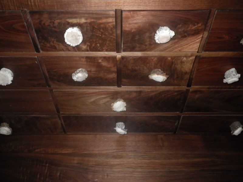 A close up with the drawer pulls installed. They are made from deer antler.