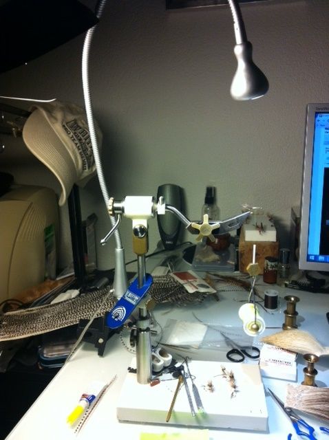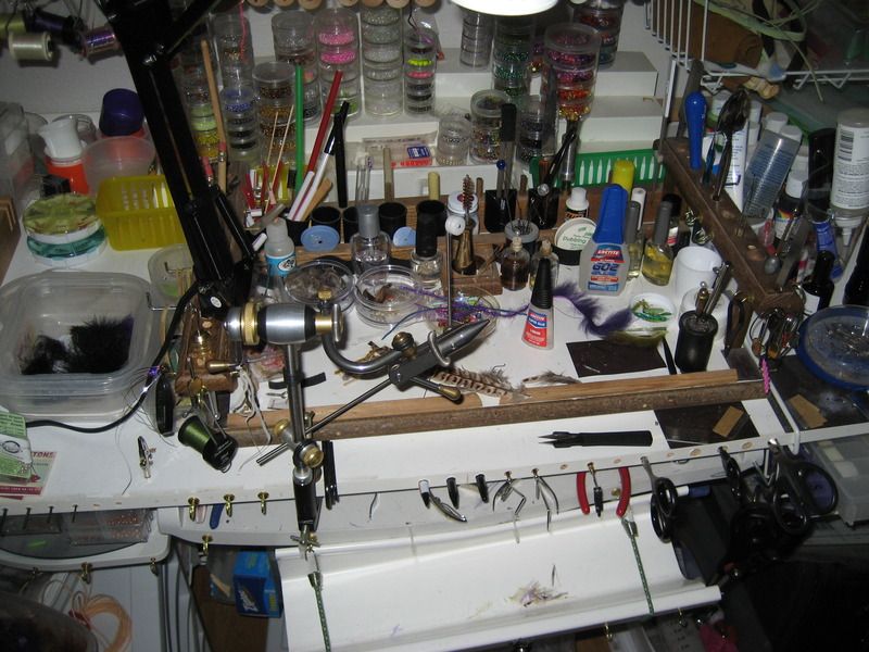 Here’s what I’m working with as a tying area and materials storage. I hope someday soon to get out of the basement and into better light as soon as the last of my kids are moved out.