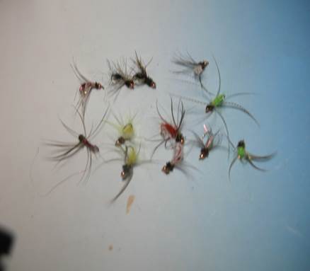 The rods all had flies on them; a black boa yarn leech and the Dr. Mike. The Dr. Mike is a pattern from an old magazine. It started out as a Steelhead fly and was downsized for trout. I thought that it looked like it would work for panfish. Pattern is: hook your choice with bead head to match, abdomen dubbing loop, hackle is soft type, and peacock for thorax.