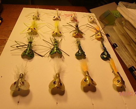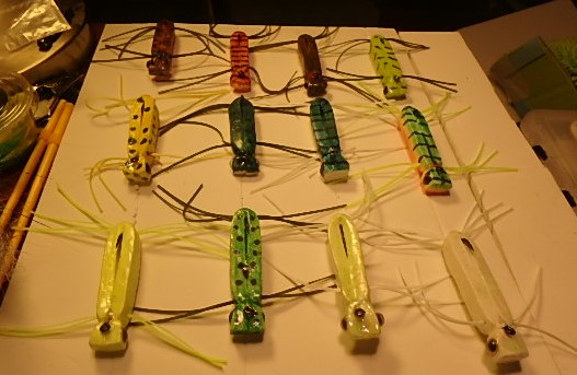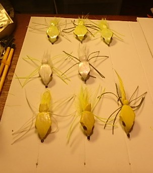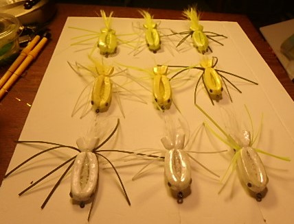 For lack of a better name I calls this one the Heart Popper. Based on a foam pattern shown to me by Harrison Steeves, instead of the head being glued to the sides of the body, I left them open. I added legs on the ones in the bottom two rows since I took the picture. Has a bit of a Jitterbug action when retrieved with a steady strip.