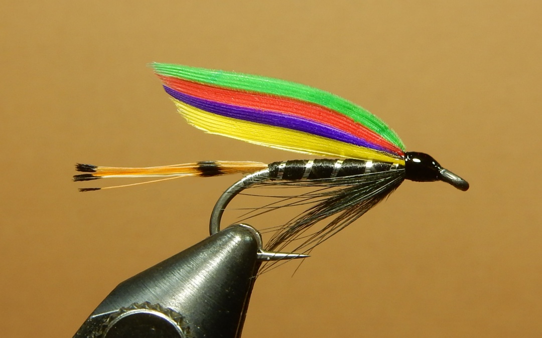 Tip - Silver tinsel Tail - Golden pheasant tippets Ribbing - Silver tinsel Body - Black floss Hackle - Black Wing - Green, scarlet, purple and yellow duck or goose quill segments