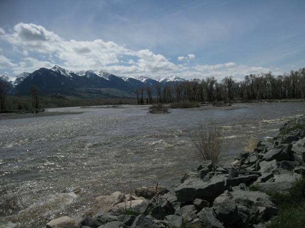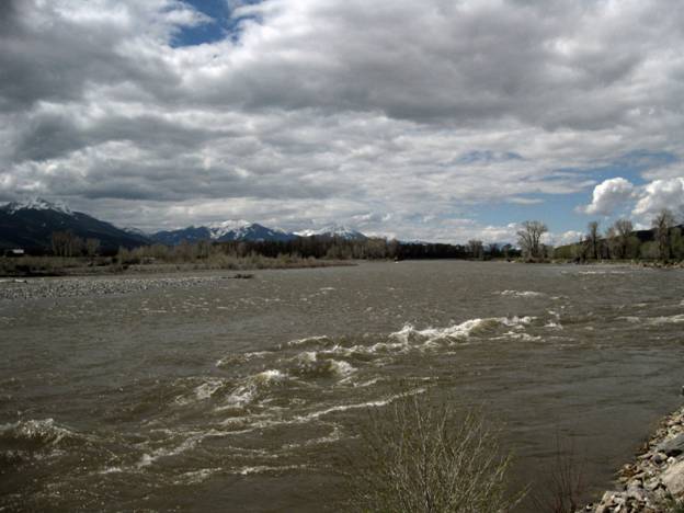 Yellowstone River – May 16, 2011 – much more water than in the previous images – note the heavy snow still remaining in the mountains.