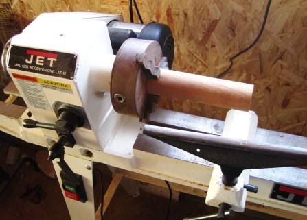 When I left off I had finished glueing up the bottom piece of the handle. Next step was to shape this piece. Ideally I had wanted to mount a short piece of rod onto a jacobs chuck and then slide the handle piece on to that. Kind of a free floating mandrel. Well the jacbos chuck wouldnt open up wide enough, and my three jaw chuck wouldnt close far enough so I decided I could just make one out of some scraps I had laying around. Here is the scrap wood mounted up in the lathe…