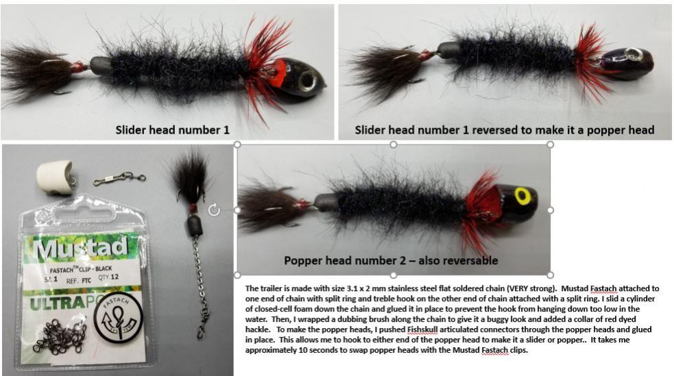I got the idea for this pattern over on FaceBook from a talented guy named Graham Weakley[SIZE=2][FONT=arial], [/SIZE][/FONT][SIZE=2][FONT=arial]so I thought I’d play around with the idea. This popper system will allow me to very quickly change the look and action of the flies without having to completely change the fly. I mess around with his ideas and came up with a solution that looks like it’s going to work well for me. (see the attached photo). I used a size 3.2 x 2 MM stainless steel flat chain the has the links soldered as the trailer. This is available from Etsy for about $8 for 10 feet. This stuff is VERY strong and very limber in the water since it is actually made to be worn as a neck chain. Think about how a small-linked neck chain gets when it is made into a small pile and you’ll get the idea of how limber this stuff is. I used split rings to attach a treble hook to one end of the chain and a Mustad Fastach clip on the other end for quick changes. To make the popper head, I used Fishskull links pushed through the popper heads and glued in place. You can dress the popper heads and trailers anyway you want and this system actually allows me to swap from a slider head to a popper head by just reversing the popper head. Anyway, I thought I share what I was doing with Graham Weakley’s idea in case anyone else is getting cabin fever and needs some time at the bench just fooling around.[/SIZE][/FONT][SIZE=2][FONT=arial][/SIZE][/FONT][LEFT]