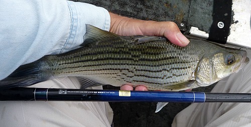 I am confident that the rod could stand up to smaller stripers and wipers. The fish shown here was caught with a Kiyose 36SF, which is a less capable rod than the 43MF. I think it qualifies as “smaller.”