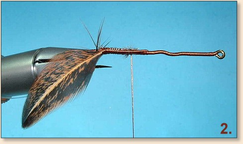 down the bend for the weedguard. - Tie in a genetic hen feather at a 45-degree angle