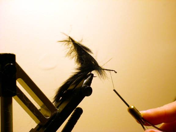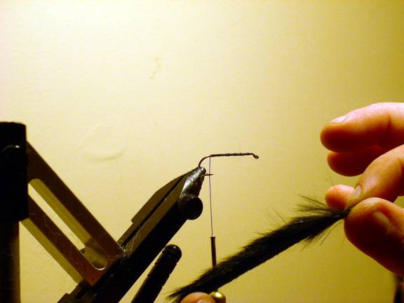 - Separate the fur at the tie-in point on the strip, and tie it to the hook