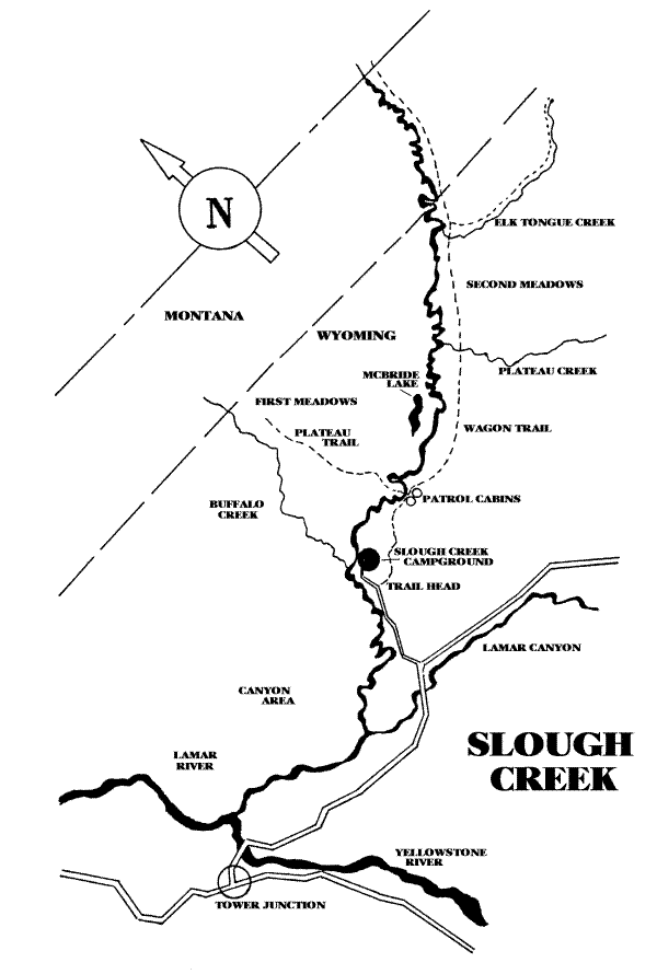 Slough Creek wanders through some of the most scenic country in the world and offers the visiting angler some of the finest fishing found in the northern end of Yellowstone National park. The headwaters of Slough Creek are high in the rugged Beartooth Mountain Range in Montana. The creek flows in a generally southern direction until it joins with the Lamar River. Besides the excellent fishing offered by the creek, visitors will also have the chance of viewing many forms of wildlife. Approximately 16 miles of Slough Creek runs through the Park and it is this section which we will be covering. For the purpose of better understanding Slough Creek I will break it down into three sections.