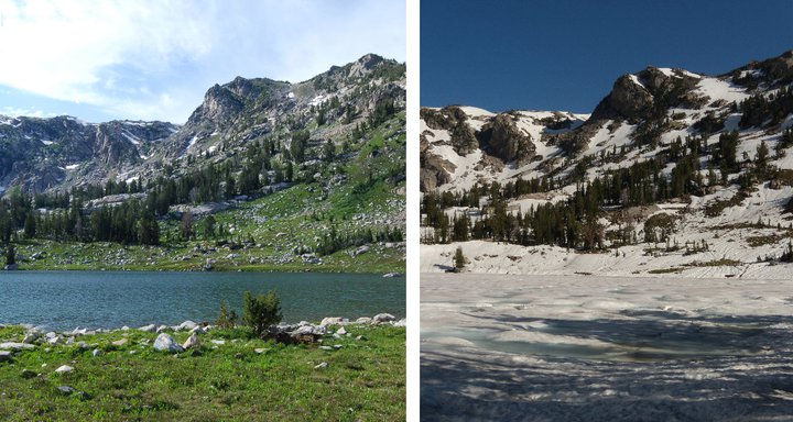 Here is an image of Lake solitude in Teton National Park, from July 26, 2010 on the left, and july 29th, 2011 on the right.