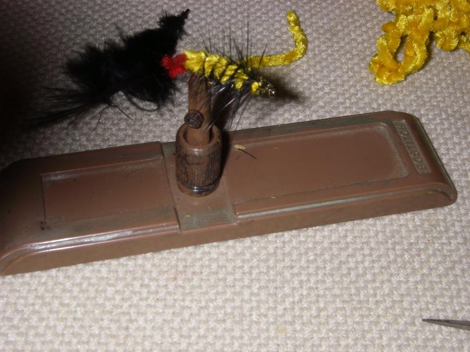 I found this again yesterday. It may be my answer to Byron’s question of which vice you would want if you had the choice. When we moved to Reno Nevada from Michigan fifty years ago one of the biggest changes for me and my brothers was no longer being able to dig a few worms and walk a couple of blocks to go fishing whenever we wanted to. Most weekends in the three summers we were there Dad would pack us all into the car with a picnic to swim and fish at pyramid lake. The seasonal pass to the reservation was generously inexpensive and gas was still cheap then. Unfortunately tackle for five of us fishing added up as the bottom seemed to be nothing but snags. One of the most successful methods of catching the Sacramento perch that was our main catch was to cast as far as we could with our spincast outfits and slowly retrieve a woolly worm, usually yellow and black. Dad made this up so that he could make the woolly worms himself. I knew I had it somewhere but hadn’t seen it it years. I tied one more woolly worm on it and put it away again. It really is a pain to use.