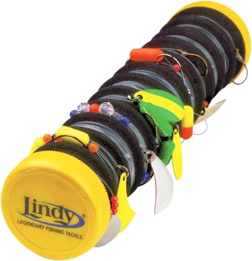 Try a spinning tackle shop and ask for the Lindy rig holders for walleyes. They’re tubular, anywhere from 6 to 12 inches long and 1 to 3 inches in diameter, and have eyes and Velcro tabs that hold the pre-tied rigs. I stick them in a plastic baggie to protect them.
