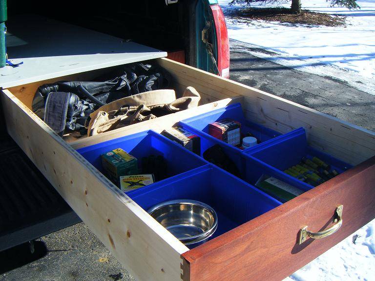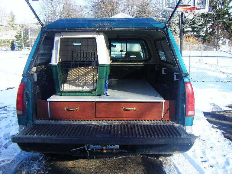 Ford F150 with Leer cap. I have a piece of 6 inch foam about 7 x 3 1/2 feet I use to sleep on. I will take a small folding camp table, folding chair, 2 burner stove, lantern, small cooler. Cooking gear and other necessities are packed in an action packer. This is usually good for 4 to 5 days of camping. Most of this stuff is in the garage ready to go. A stop at the store for ice and I can be packed and gone in less than an hour if someone tells me the fish are biting.