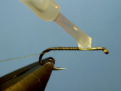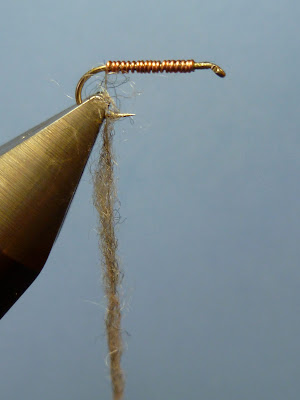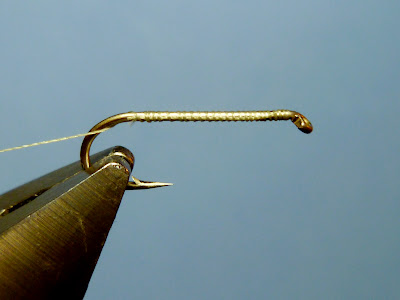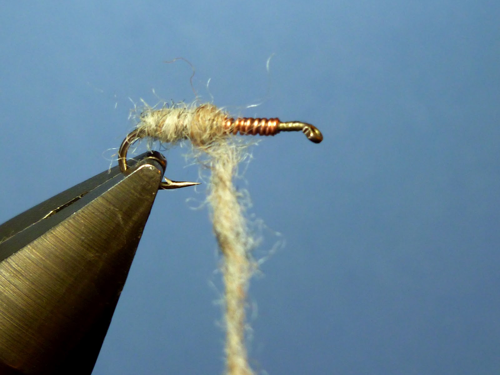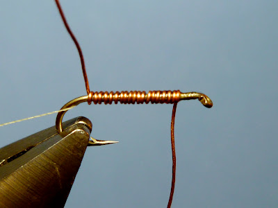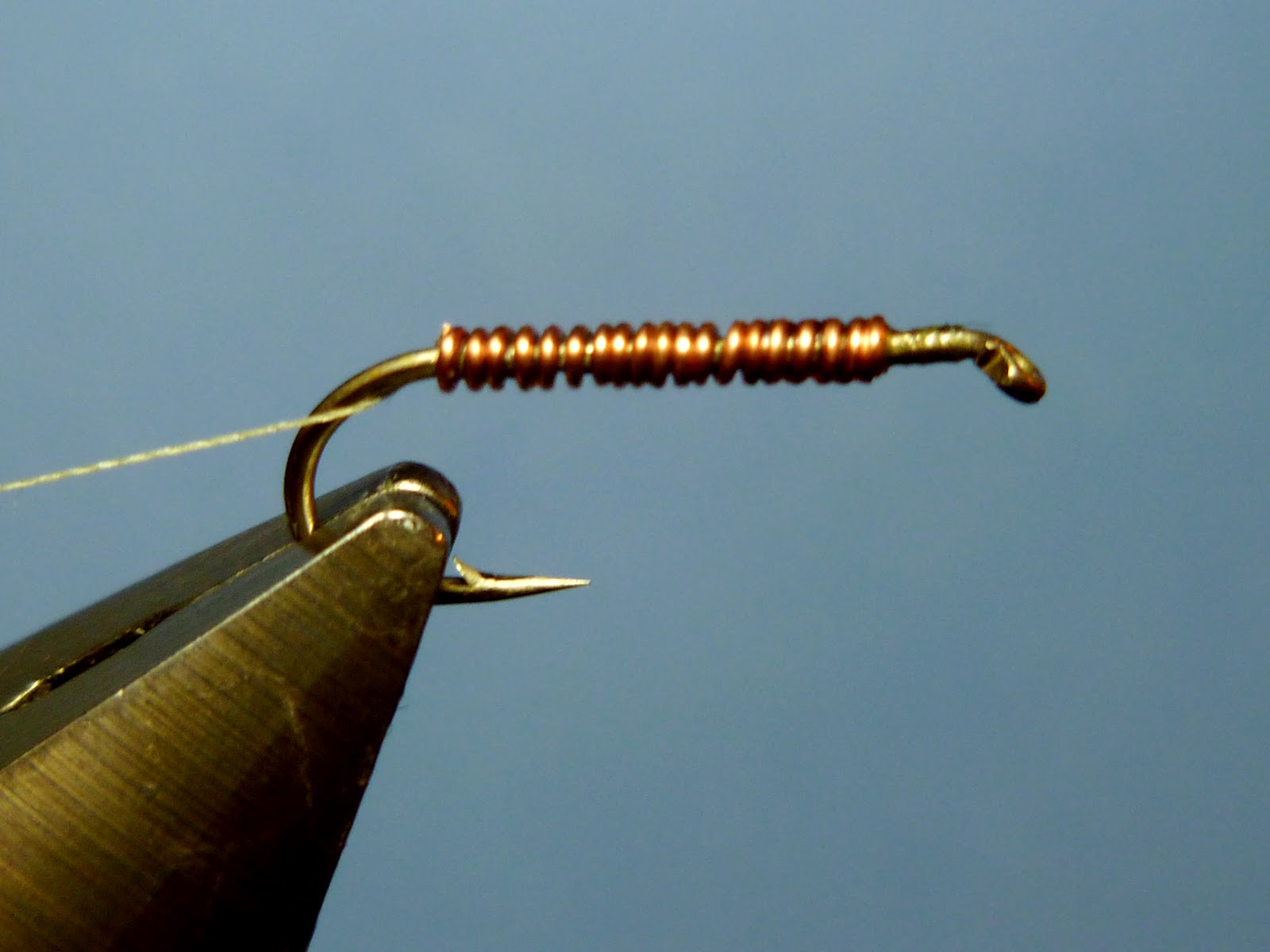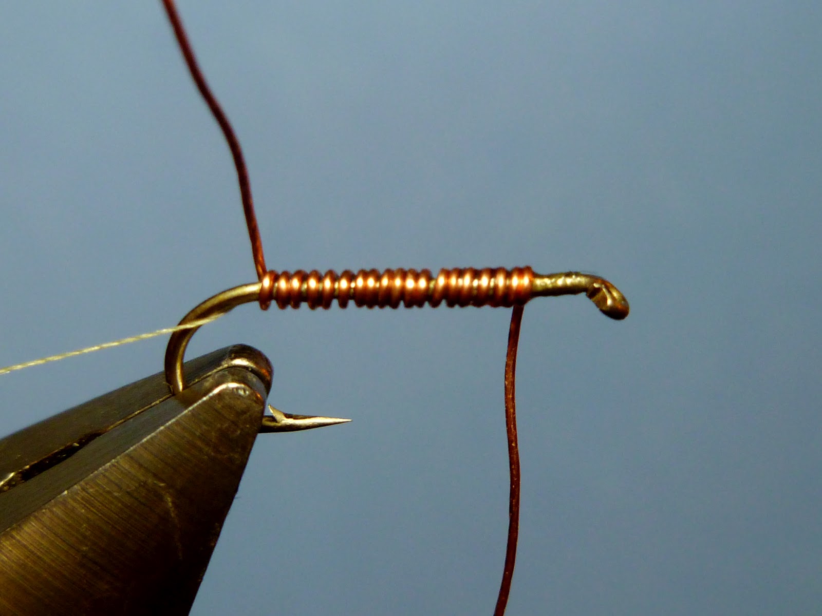 Start copper wire at the bend and work forward to one eye length behind the hook eye.