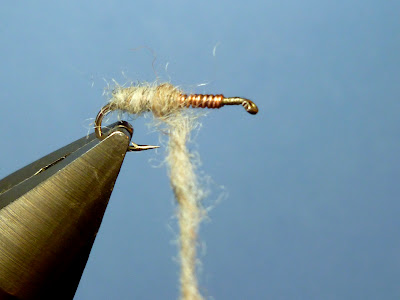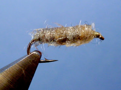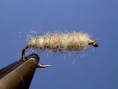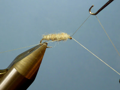 Body: Patons Classic Wool Natural Mix (00229) yarn made into dubbing. Note: the Patons yarn is a very good substitute for Chadwick’s 477- wool that was used in Sawyers Killer Bug. Or you can use Hareline Hares Ear Plus #1 or #7.