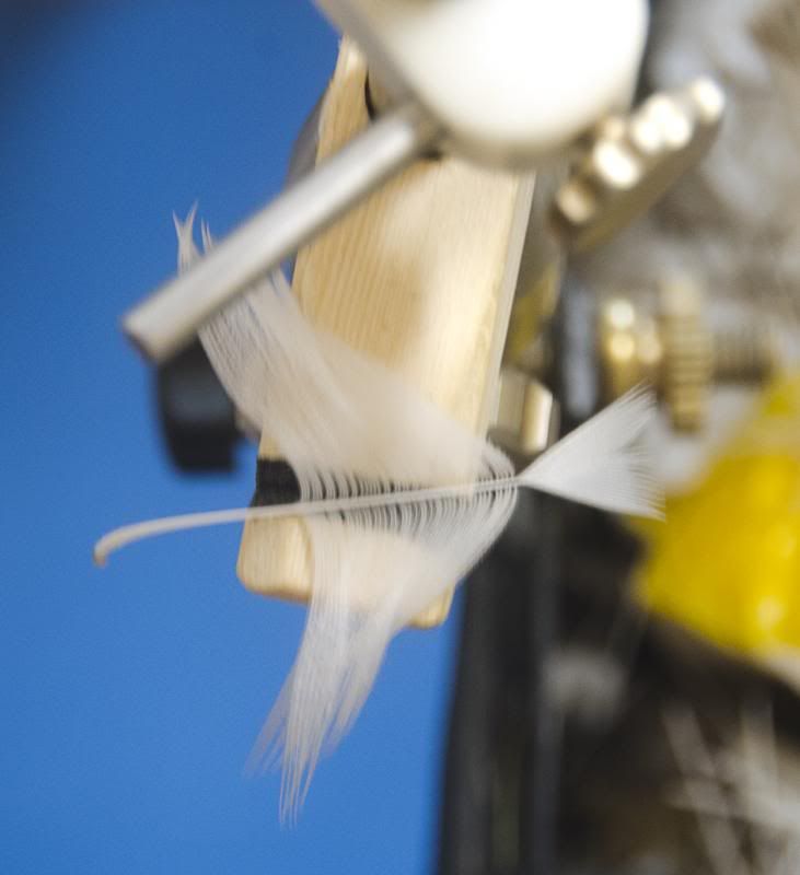Folding the feather is easy if you have three hands working together. Recently I’ve developed a tool to make the fold. Push the feather in and draw it out folded and in the pinch you use to tie it on. Its saving me a lot of time and much cursing. I was amazed at how well my prototype worked. Must look into making more of them. Here it is. Directions presume right handed tier.