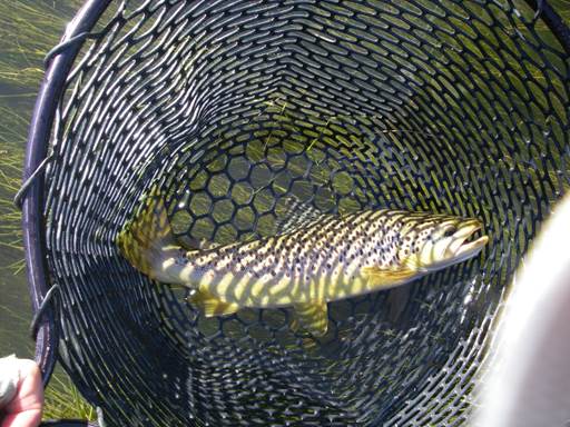 Before the weather turned foul we found a few fish rising to a smattering of trico spinners. Normally the tricos on the Bighorn are a respectable size 20 to 22 but this year they make a size 26 look oversized. Fortunately I had a few tricos of the appropriate size and I landed a decent hook jawed brown with one of these tiny imitations. A few minutes later I hooked another similar fish but he was not as cooperative and took me for a ride through the weeds before we parted company. The tricos disappeared, the rain and wind started and I sat hunched over in the boat wondering why I loved fly fishing so much. As the wind dripped off the hood of my rain jacket golf began to sound like fun!