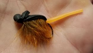 Cute little fly. I have a small “mouse” pattern that I tie for Bluegill fishing. It’s based on the Splinter Mouse pattern. I play around with the tail material, this one happens to have a bit of rubber toy tentacle for a tail. I suspect that this would also work well for Brown Trout or even good sized rainbows.