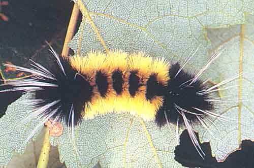 Lophocampa caryae caterpillars are white and black and are covered in grayish-white hairs. A row of black tufts adorn the first eight abdominal segments and pairs of long black hair-tufts grace the first and seventh segments.