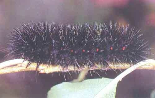 Ecpantheria scribonia caterpillars, have dense coat with coarse black hairs of equal lengths, they curl up in a ball when disturbed, revealing bright red intersegmental rings. The small circles surrounding the spiracles are also red.