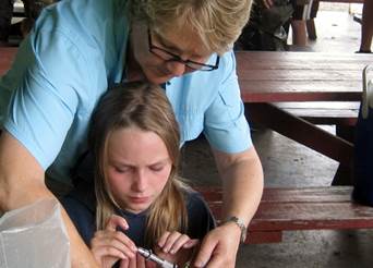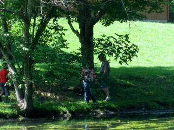 The third group of ten we took to the pond area and taught them to cast a fly rod with a “yarn” fly. No hooks at this stage! Then as soon as the casting lesson was over we took them to the nearby pond and let them cast for whatever they might catch; mostly small sunfish.